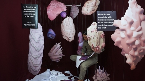 The live performance could be streamed during the festival and was divided into three sessions, during which ones the artwork evolved and interactions with the audience took place. The different body parts were inhabited by microorganisms harvested through the screen from participants willing to donate some of their microbes.